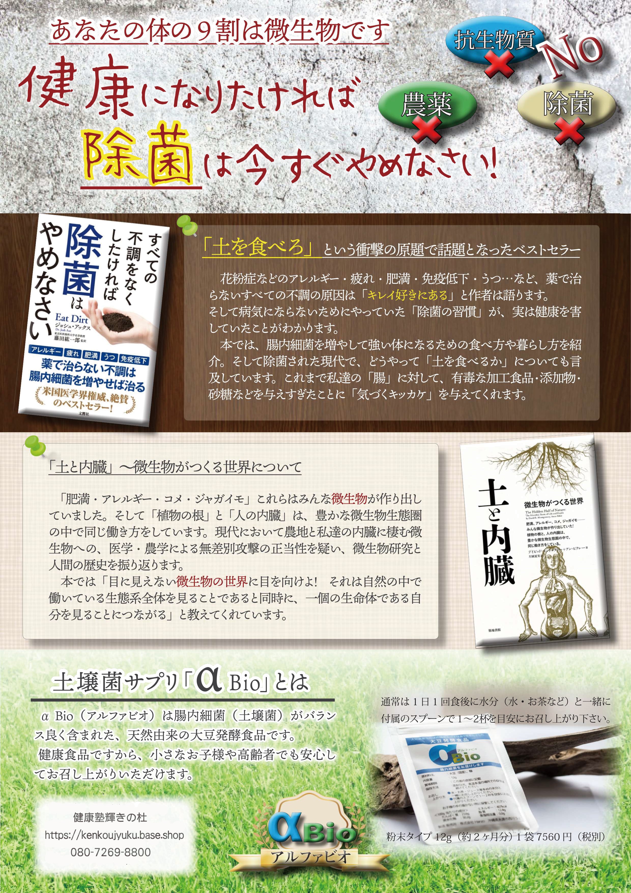 アルファビオは酵素に繋がる土壌菌由来のBF4菌群(たんぱく質分解菌群、でんぷん分解菌群、油脂分解菌群、セルロース分解菌群などの栄養素分解菌群を含む腸内細菌群)をバランス良く含んだ大豆発酵食品ですので、腸内細菌の理想的な補給が出来ます。